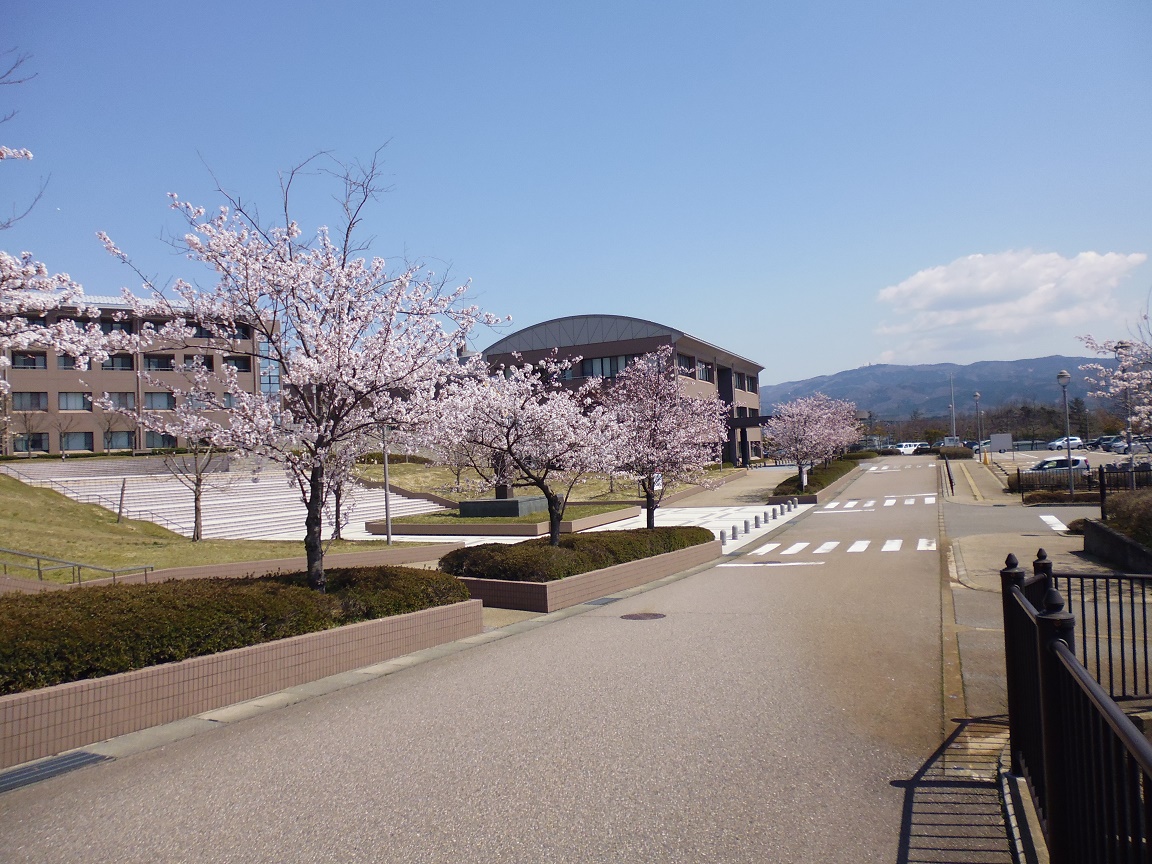時々横を通る看護大学の桜も、能登の最高峰宝達山をバックに美しく咲き誇っています。