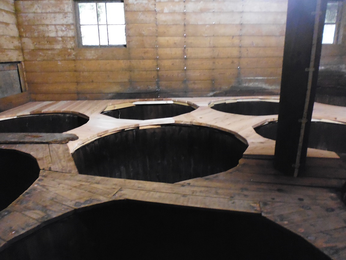 杉樽が並ぶもろ味蔵の古くなった土場を修理し、